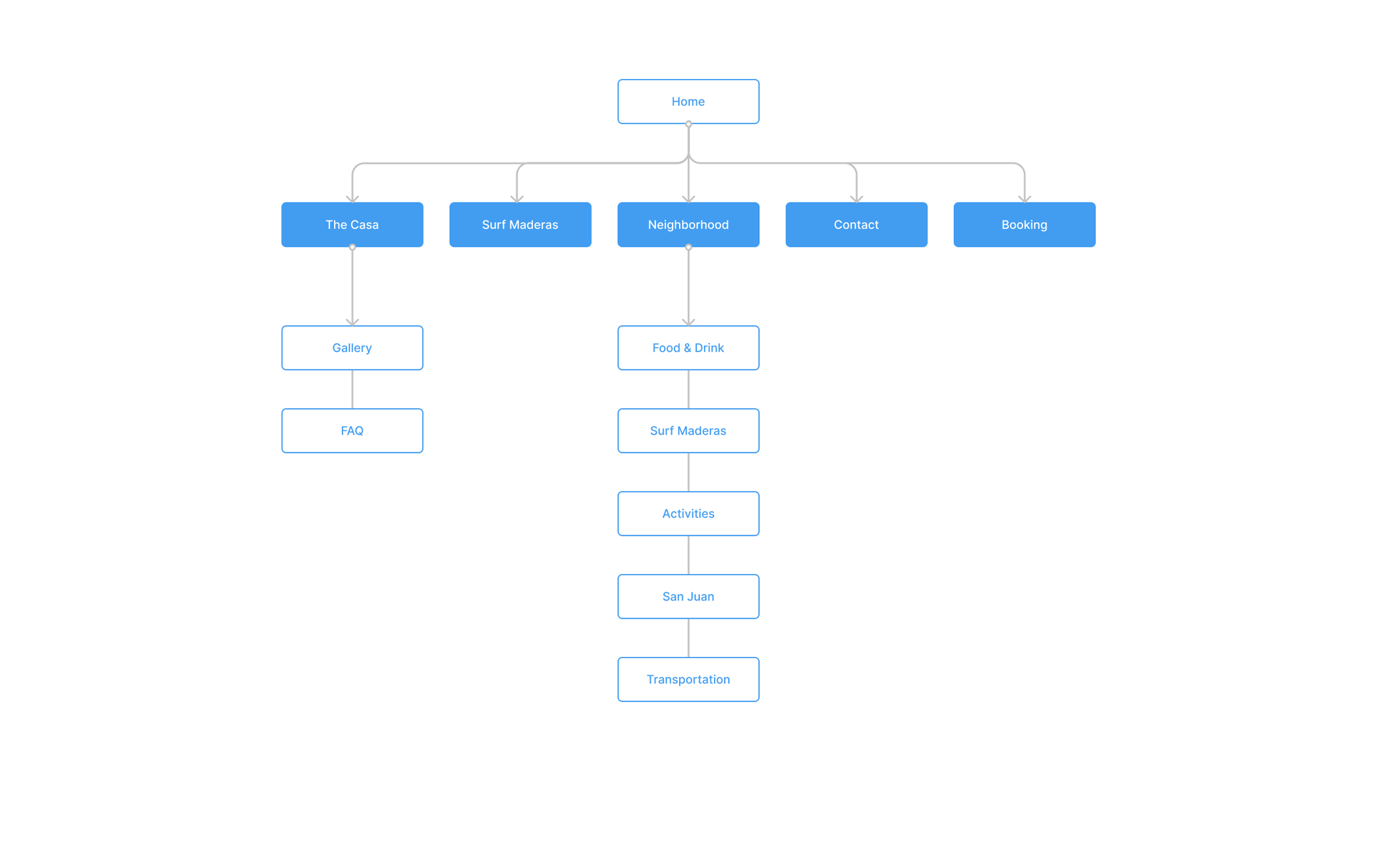 The original sitemap was more ambitious with a section dedicated to amenities and another for a ‘travelers notebook’. We decided for an MVP to cut this idea for the time being and come back to it down the line.