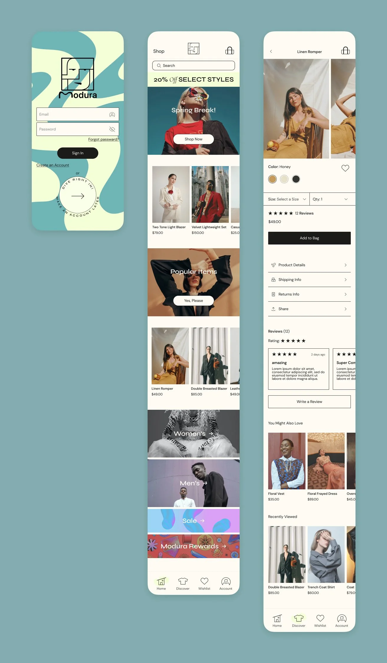 My debrief was to create an app for a concept clothing brand called Modura. In addition to the app, I were tasked at creating a logo and establishing the branding including typography and color palette. Modura concept; e-commerce clothing brand, trendy men and women age 18-25, affordable business casual, fashion forward trend-conscious.